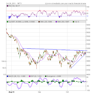 European markets dropped after the little hope to fix the debit crises on Monday. Indian markets were consolidating amid the news but U.S. markets sank sharply after opening. Banks stocks are the big decliners in European markets. China showed Gross Domestic Product data 9.1% in third quarter, lower from expectations. Dow has fallen around 2% last night. Asian markets trading lower now. SGX Nifty wiped off 42 points and trading around 5080 levels. 5100 and 5200 strike rate’s call added more shorts in Nifty options on Monday, Which marks Nifty may remain weak for few days. Nifty has crucial support on 5050; decline below this level Nifty may cut off more 100 points. Nifty can be short sell below 5050 levels with strict stop-loss.